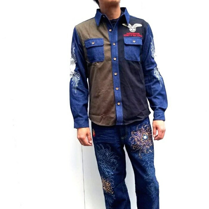 商品名 《参丸一》 サンマルイチ◆羽ばたき蛙カエル キングサイズ刺繍 長袖ツイルxデニムシャツ 品番 SSH-11038 価格 12,800(+tax) カラー ミックス *別ページでブラック・カーキ色を紹介中です。