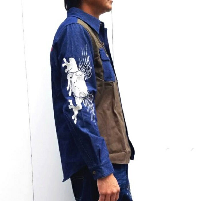 《参丸一》 サンマルイチ 羽ばたき蛙カエル キングサイズ刺繍 粋で可愛い 和柄 長袖 ツイルxデニムシャツ【SSH-11038/Mix】巨大刺繍スカシャツ M,L,XL,XXL(3L) 大きいサイズ カジュアルシャツの王道 あす楽*送料無料 スプリングギフト♪